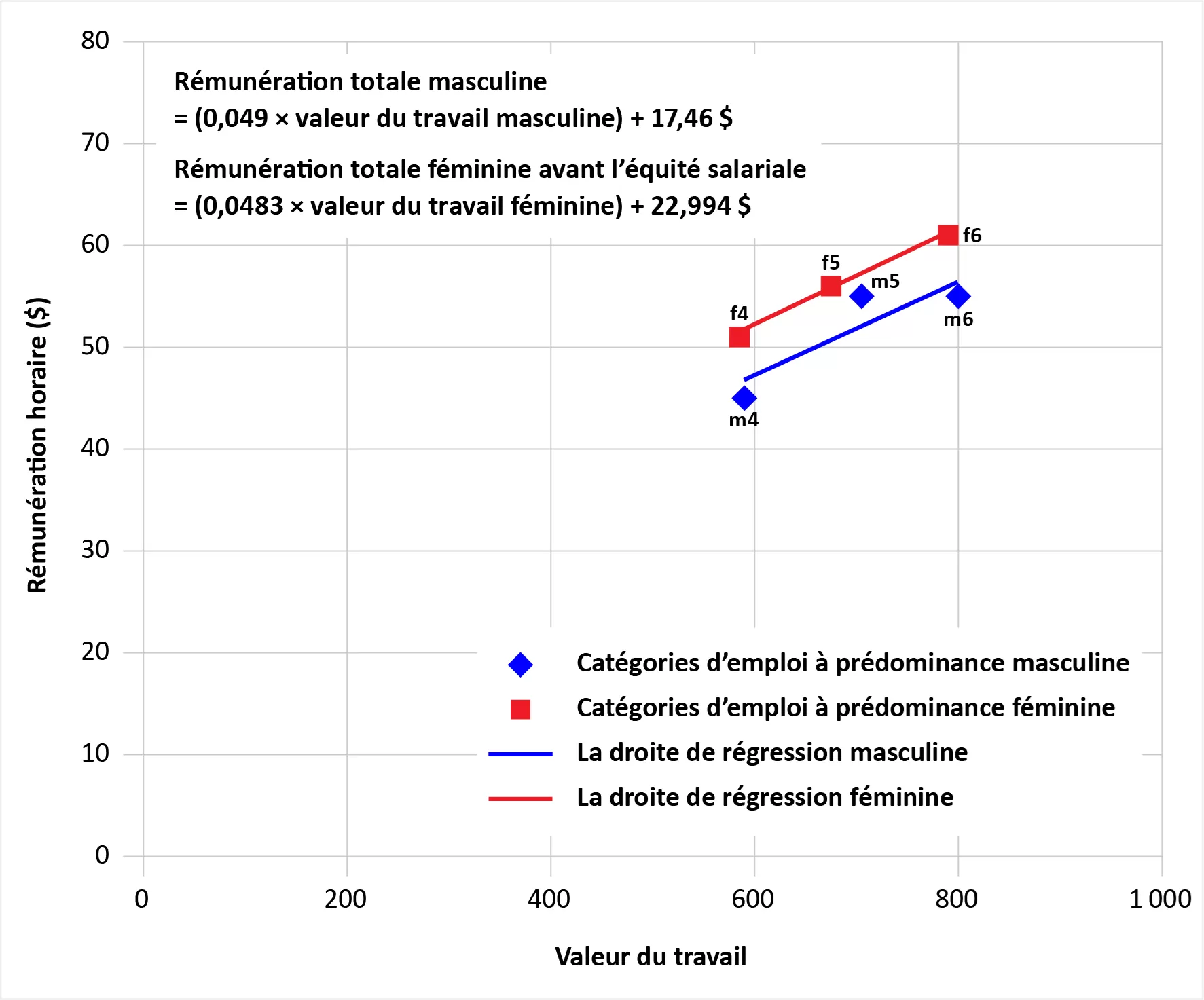 a) une droite de régression est établie à l’égard des catégories d’emploi à prédominance féminine et une autre est établie à l’égard des catégories d’emploi à prédominance masculine;